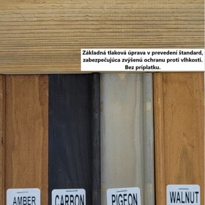Borovicové dřevo je z výroby předsušeno a ošetřeno tlakovou tinkturou AQUA-STOP po celém povrchu. Základní ochranný nástřik je třeba před montáží ošetřit olejovou barvou na bazény. Styčnou plochu dřeva a základové desky je vhodné oddělit od podkladu fólií, styrodurem nebo podobným podkladem.