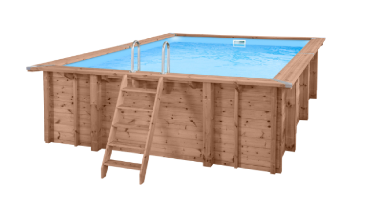 Standardní obsah: dřevěná konstrukce, lepená bazénová vana, upevňovací prvky, skimmer, vstupní šachta, výstupní tryska, geotextilní podklady pro stěny, upevňovací šrouby, vnější dřevěné schody, pochromované vnitřní schůdky