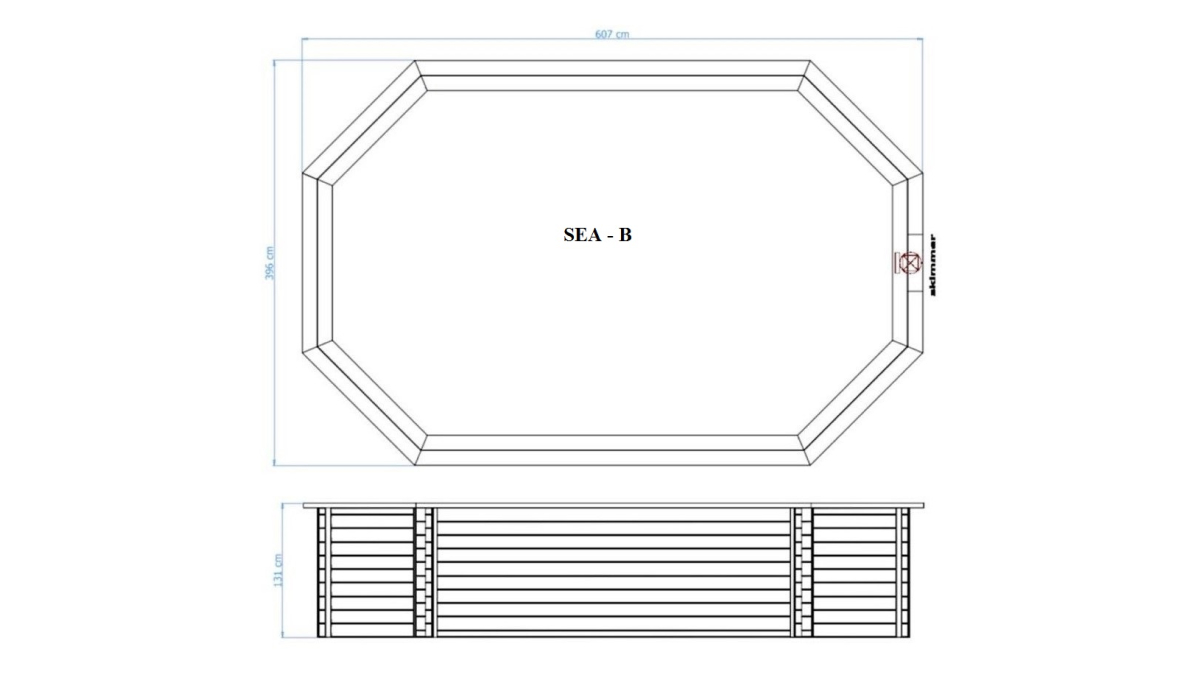 Rekreační bazén Sea-B obdélníkového tvaru zakončený efektními úhlovými stěnami. Je to plnohodnotný bazén vhodný pro každodenní sportovní vyžití pro sportovce a rekreační plavce. Jeho délka 607 cm a konfortní šířka 396 cm ho předurčuje při celkové výšce 131 cm využívat jako plnohodnotný bazén zejména pro každodenní rekreační plavání. Skelet bazénu je již tradičně zhotoven z výběrového skandinávského dřeva – Borovice. Tradiční osmiúhelníkový tvar s dlouhými středovými stěnami je velmi poskytne dostatek prostoru pro zábavu i pro Vaše plavecké tréninky. Také cena zůstává velmi příznivá a stále se jedná o jedno z cenově velmi atraktivních řešení domácího plavání.