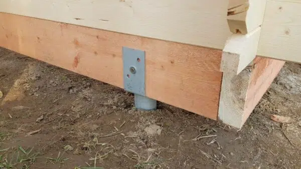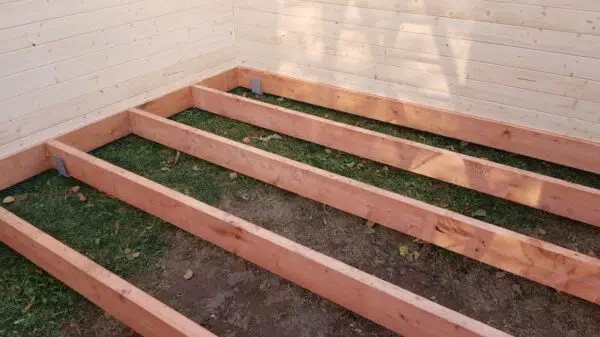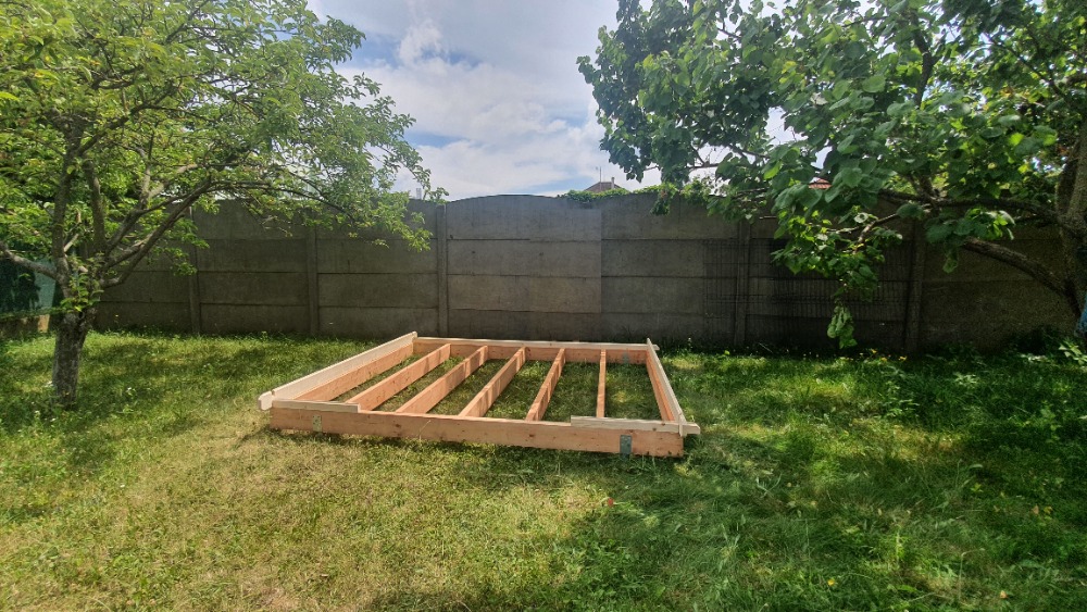 Gartenhäuser auf Holzrahmen und Erdschrauben.