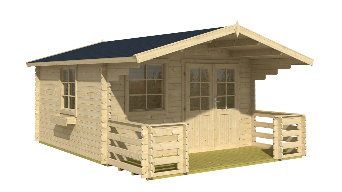● Přesahy střechy 150 cm vpředu a 20 cm po stranách chrání chatku před nepříznivým počasím